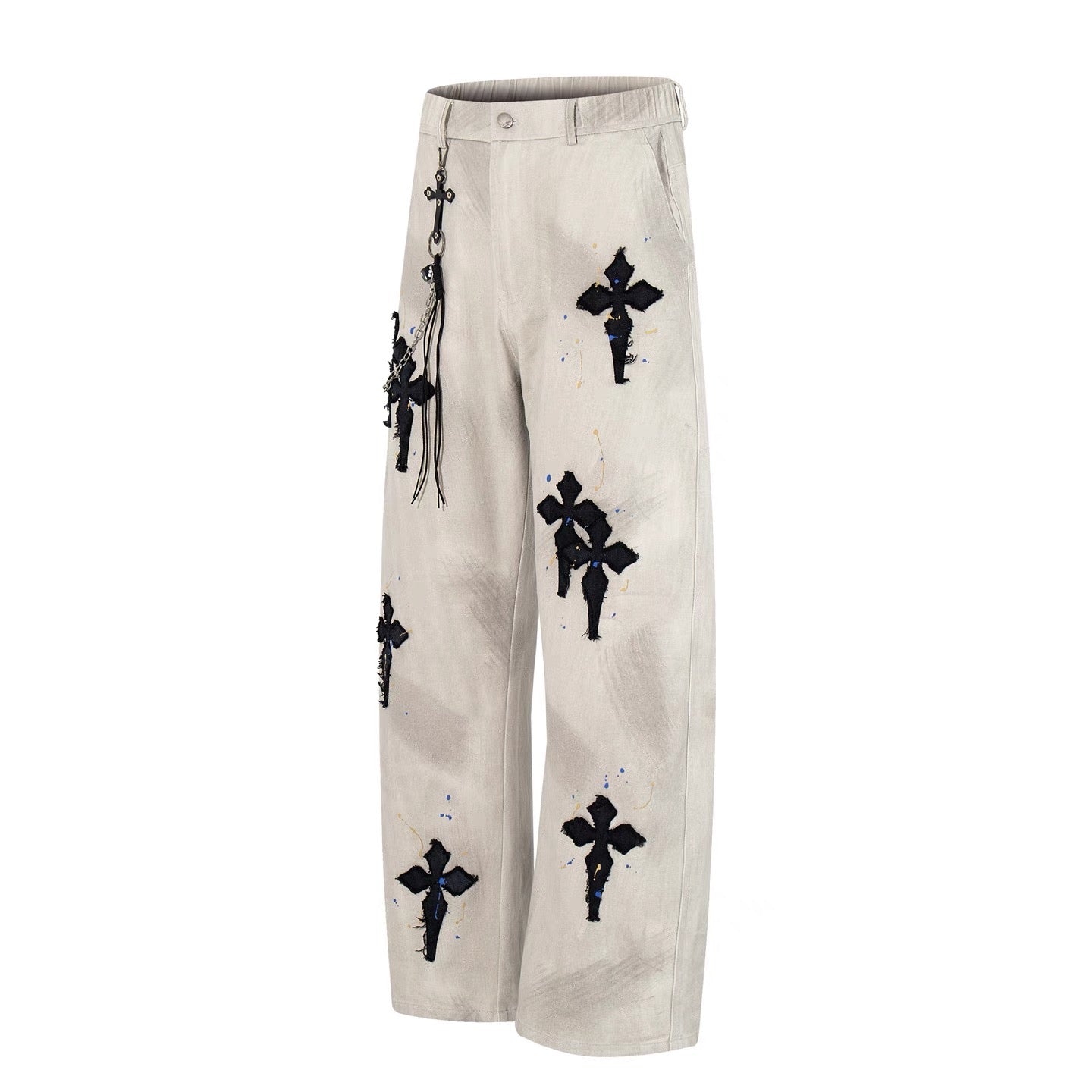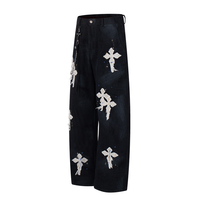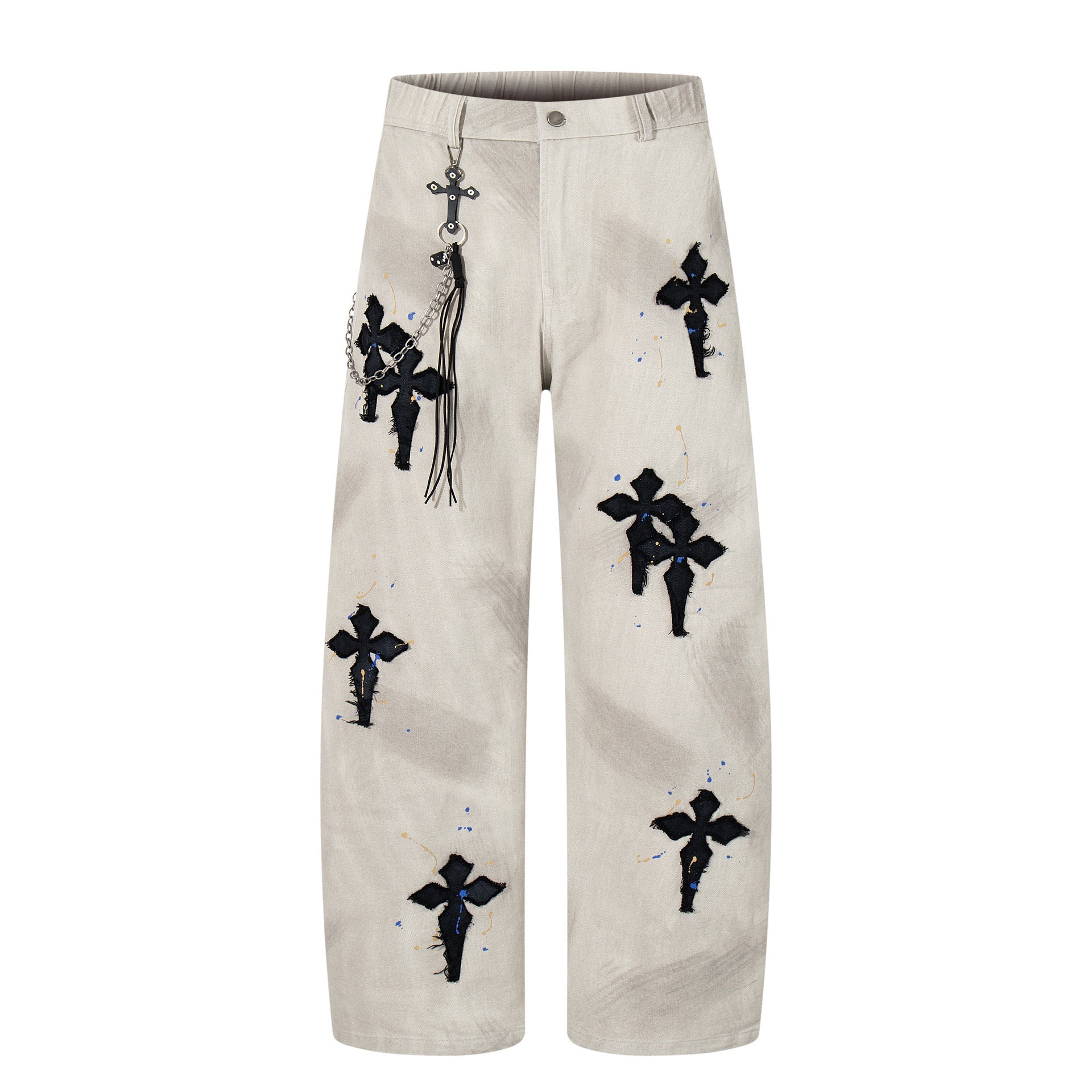 Available in two colorways, the Chromatic Denim feature distressed cross appliqués along the legs, subtle paint splatter, and a vintage wash. Each pair comes with a free wallet chain.