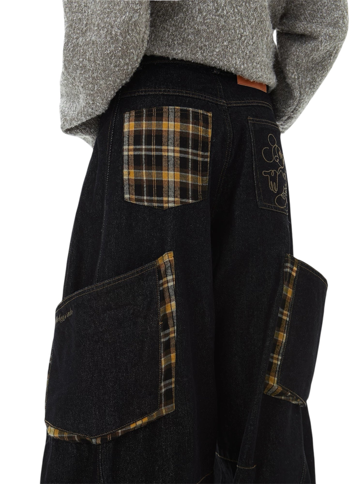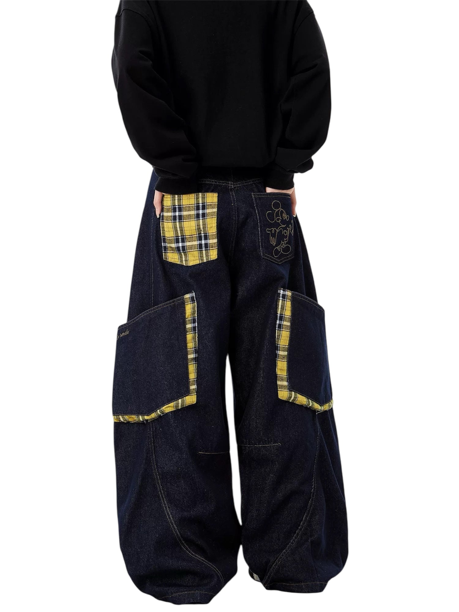 Inspired by the iconic Steamboat Willie character that entered the public domain in 2024, the Steamboat Denim features a wide-leg silhouette with plaid patchwork accents and the embroidered character design on the back pocket.