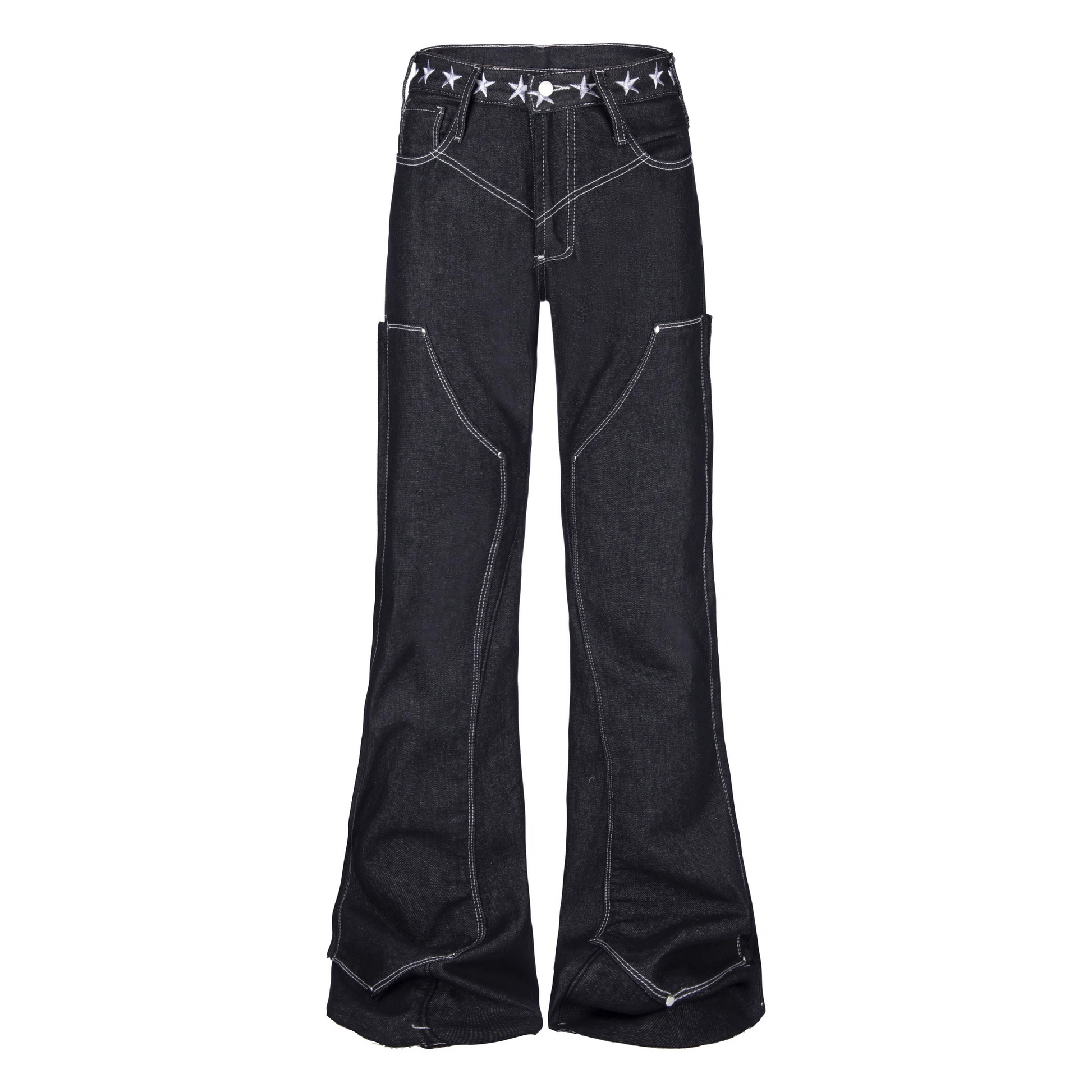 Built from raw denim with reinforced double-knee paneling, the Rave Denim feature heavy vertical embroidery running down both legs, contrasted by clean seam work and a flared silhouette.