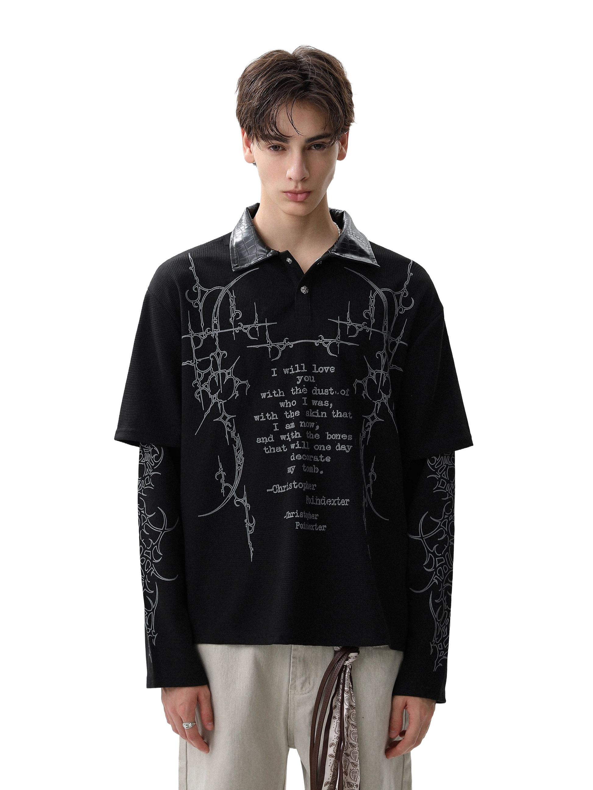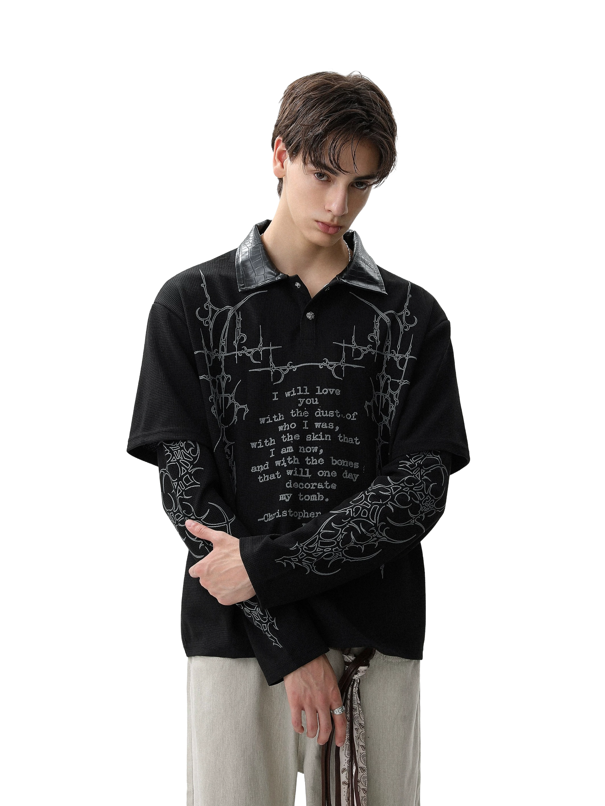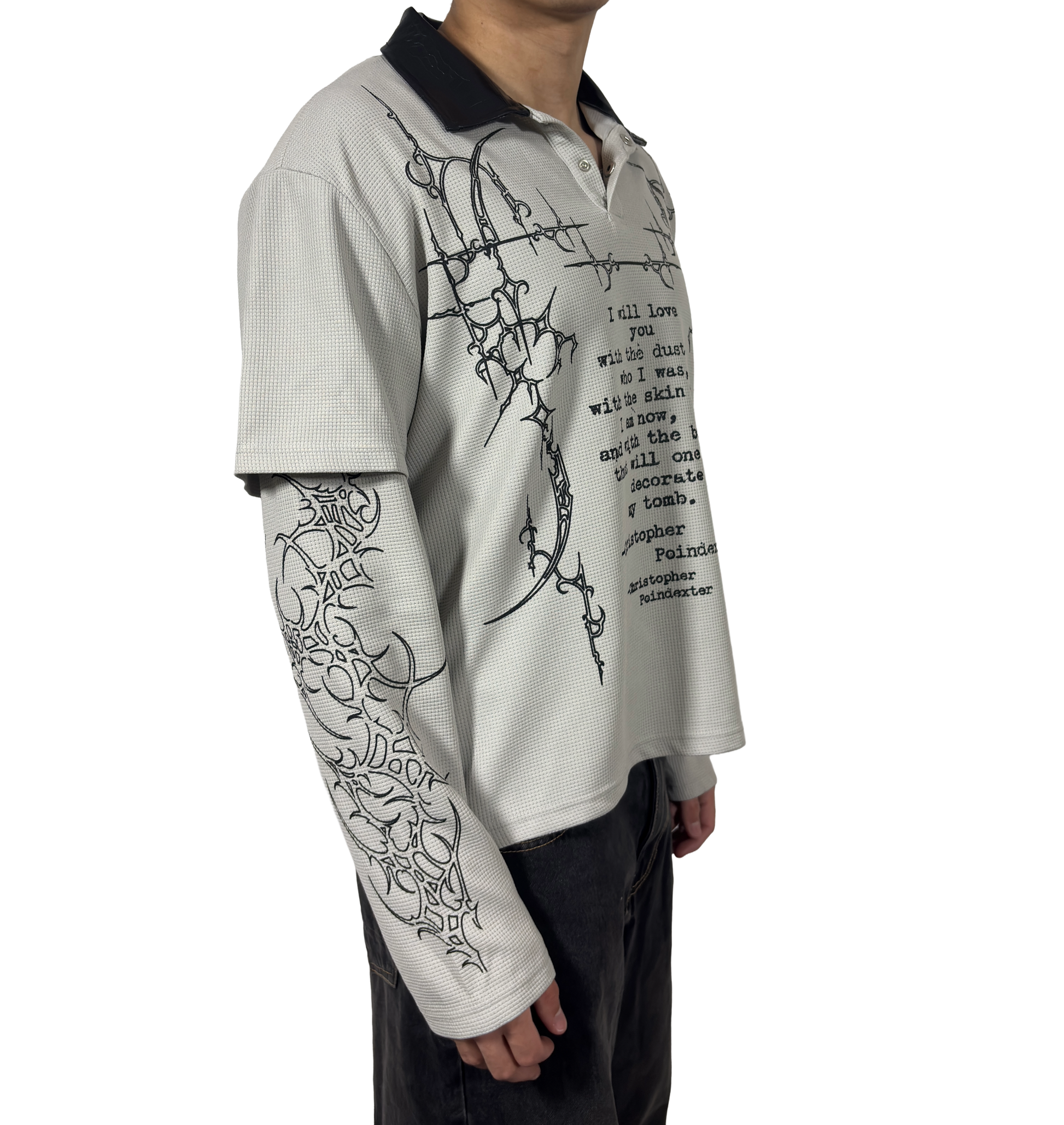 Made from 100% cotton, the Sigil Thermal features a Henley button neckline, leather collar, and built in layered sleeves. Cyber sigil graphics wrap the body around a printed Christopher Poindexter quote.