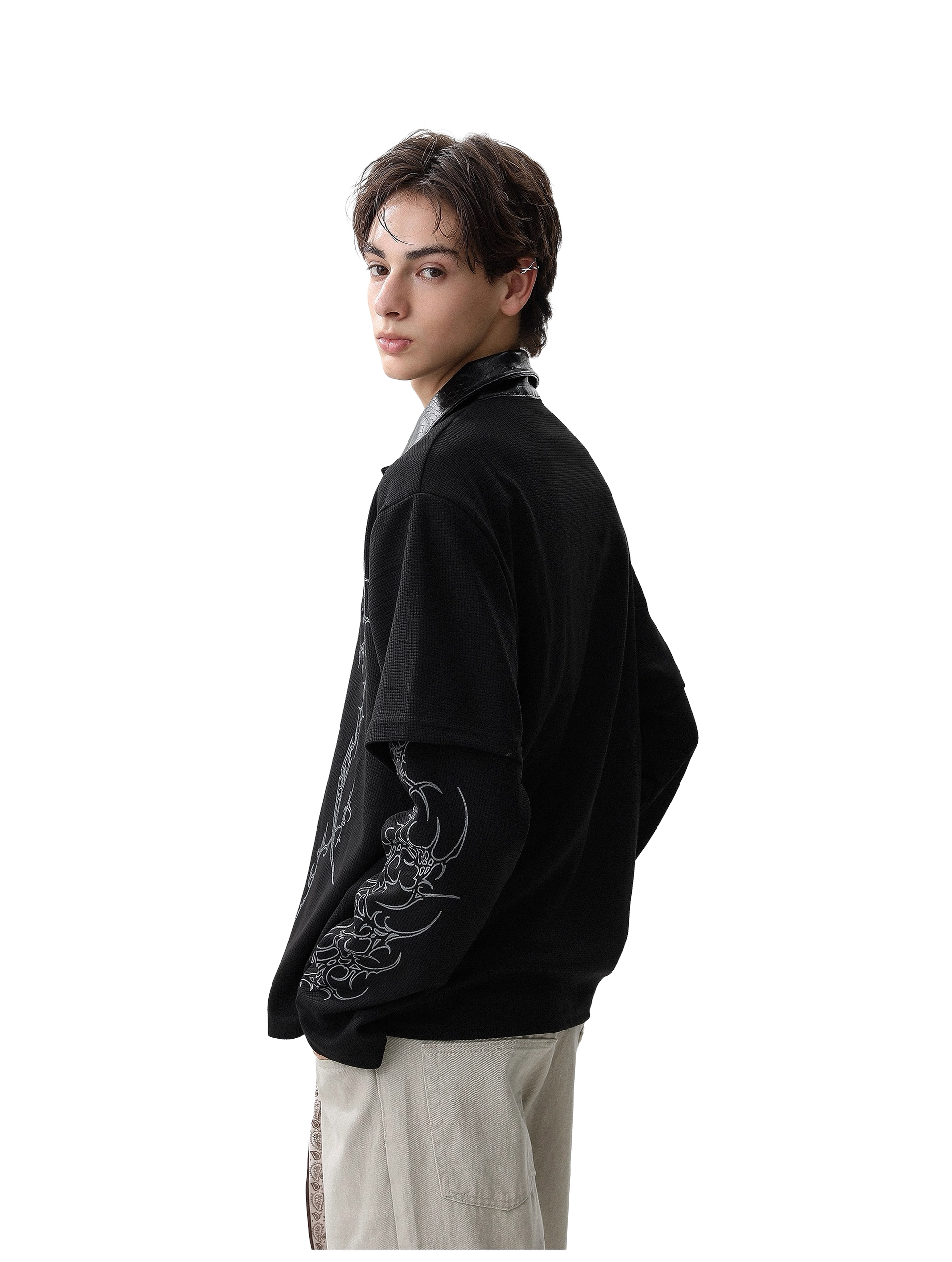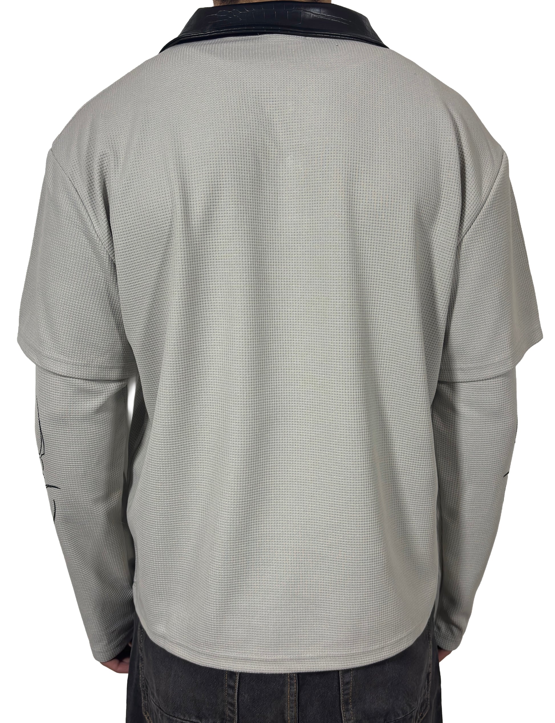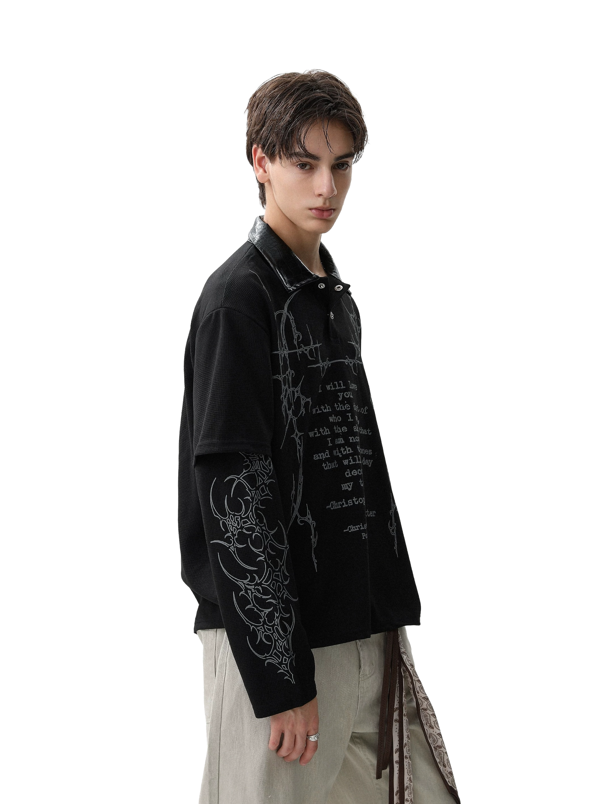 Made from 100% cotton, the Sigil Thermal features a Henley button neckline, leather collar, and built in layered sleeves. Cyber sigil graphics wrap the body around a printed Christopher Poindexter quote.