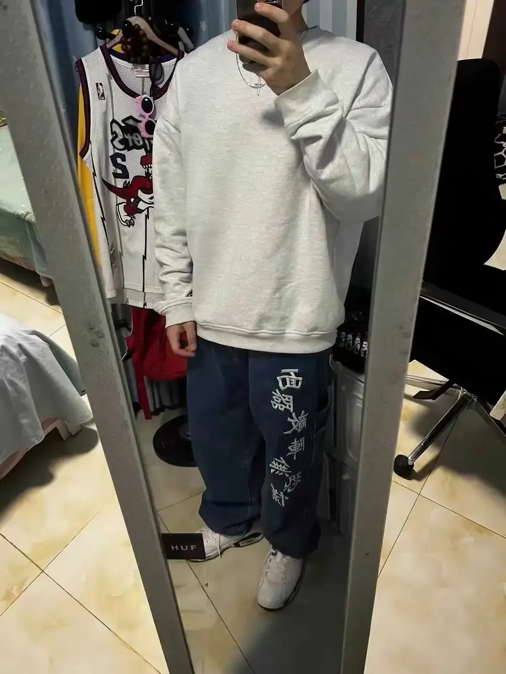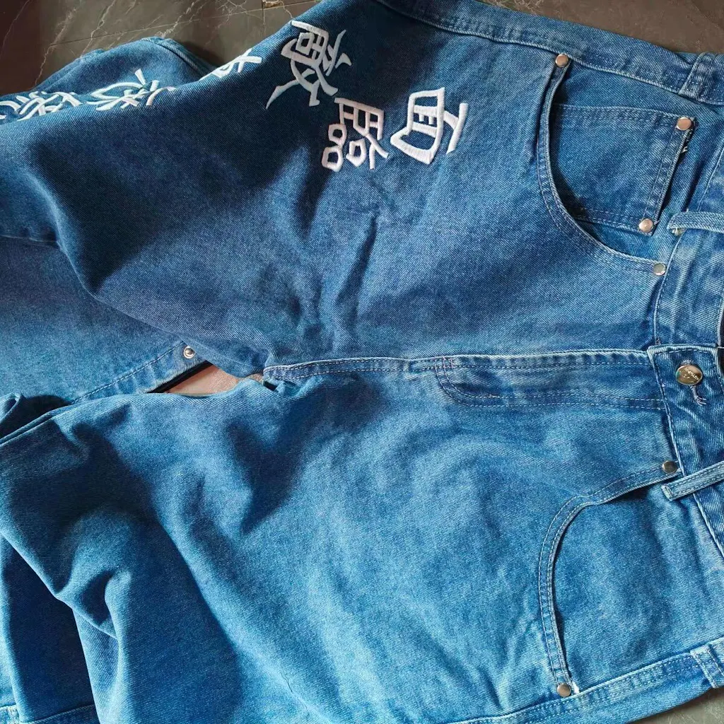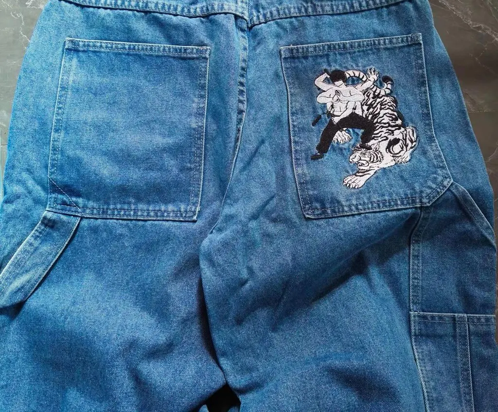 Made from 13oz denim, the Fighter Jeans feature a wide, workwear-inspired fit, “Composure When Faced With Fear” embroidered down the front leg, a fighter graphic stitched on the back pocket.